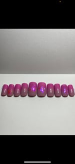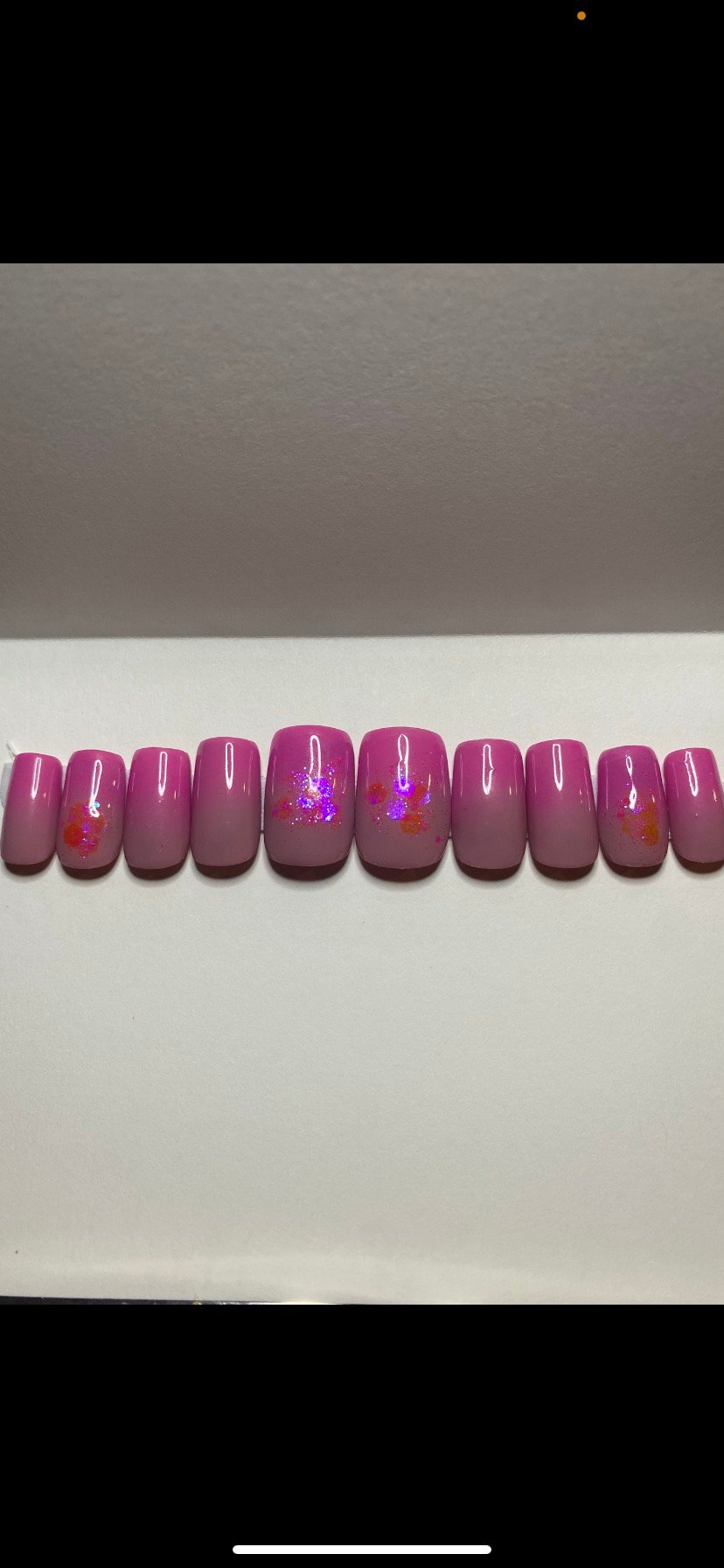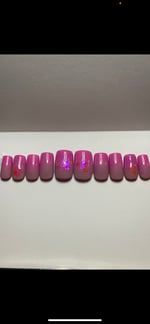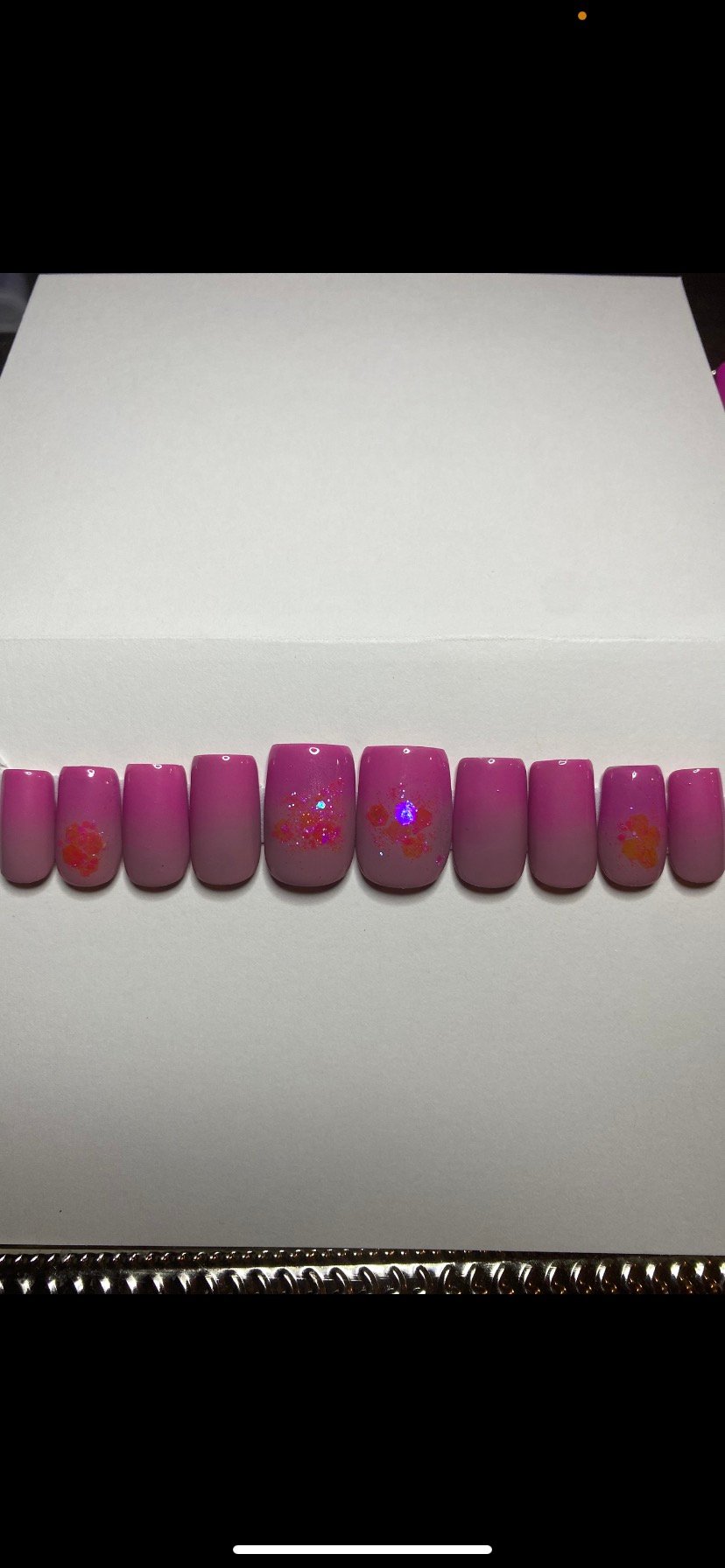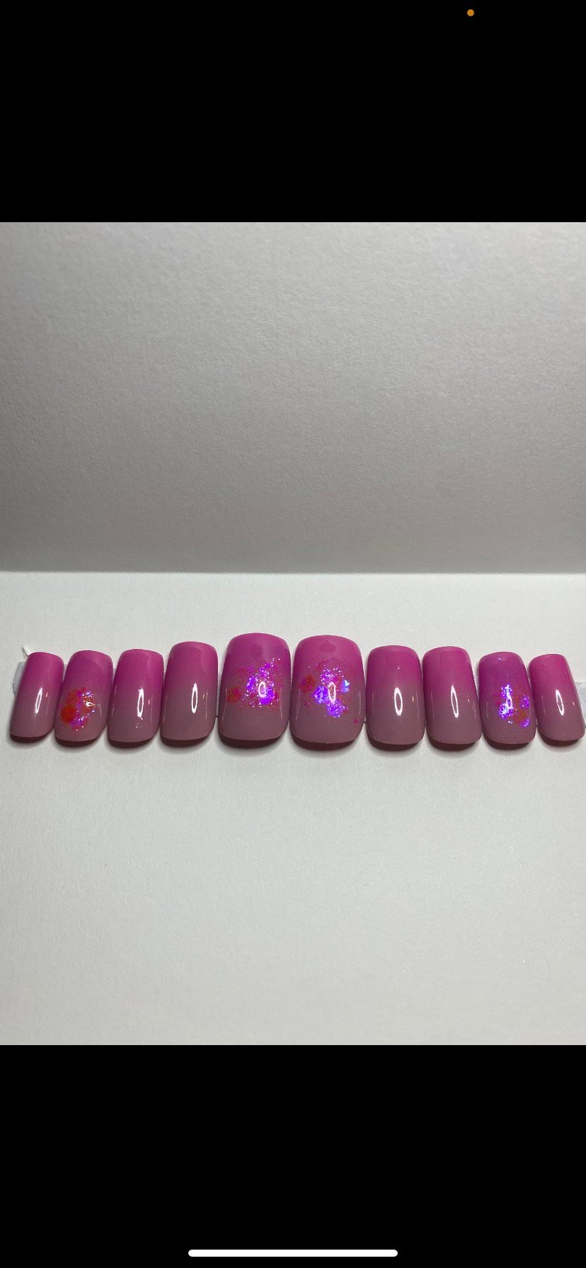 One of a kind, hand made press on nails, made in the USA. Made with cruelty free nail gels. A pretty pink with nude ombré. Some nails feature holographic pink centers giving these nails a very unique look.