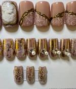 Step into an era of timeless elegance with Cameo + Lace, a handcrafted press-on nail set that feels like wearable art. Featuring sculpted antique-style cameo silhouettes, pearlescent finishes, baroque lace patterns, and radiant gold foil accents, each nail tells a story of old-world beauty reimagined for today’s modern muse. (Medium square pictured)