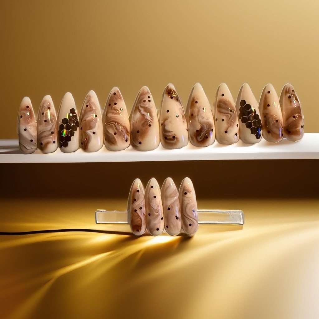 Gold Accents & Subtle Sparkle – Delicate golden hexagon embellishments and scattered specks of shimmer add a hint of glamour, ensuring your nails catch the light effortlessly.