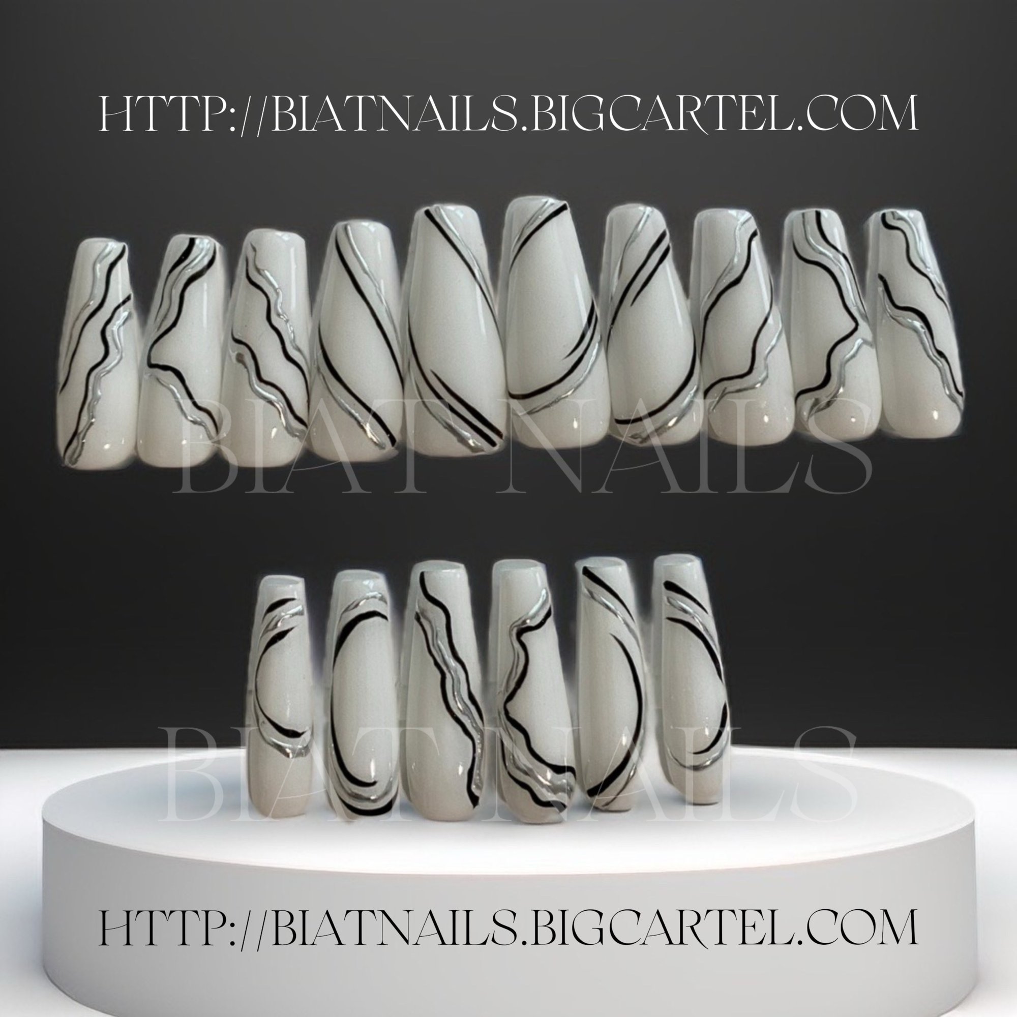 Discover the perfect blend of sophistication and minimalism with our ‘Elegant One’ press-on nails. Designed for those who appreciate subtle luxury, these nails feature a chic white base adorned with sleek black abstract lines and curves, creating an effortlessly refined look. Whether for a formal event or everyday elegance, this set elevates any outfit with its modern design. (Long length pictured)