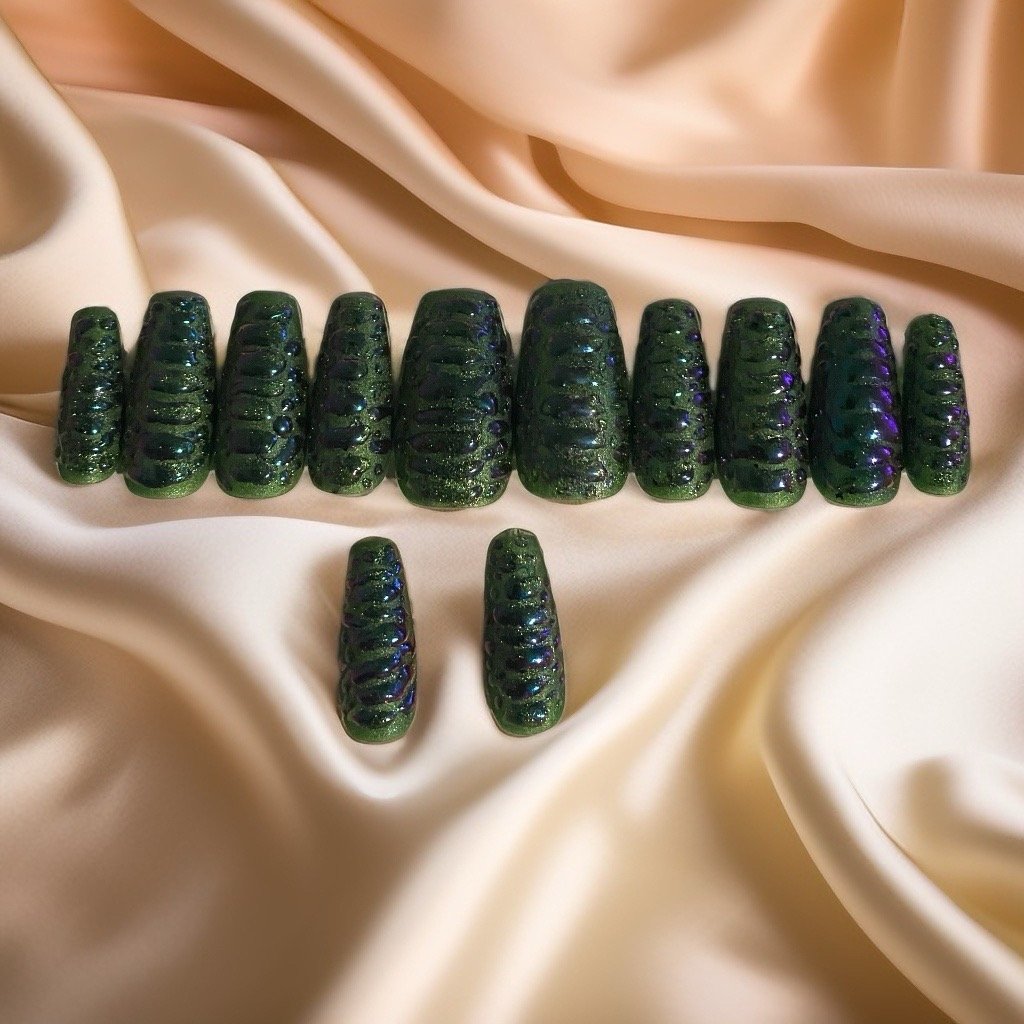 One of a kind, hand made press on nails, made in the USA. Made with cruelty free nail gels. This nail set is inspired by the sheen of some alligators. The chrome on this nail changes from blue to purple. This set is a beautiful sight to see! (Medium length pictured)