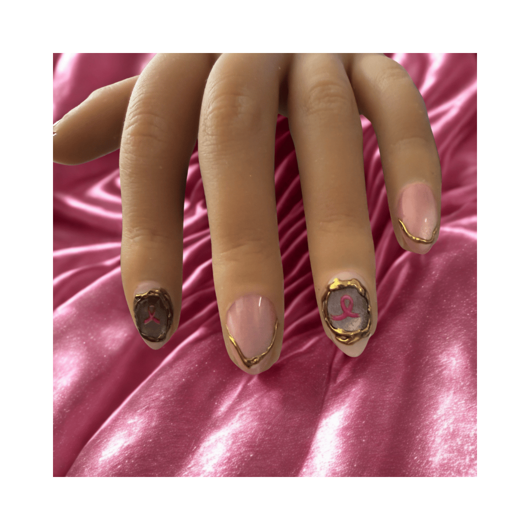 The statement nails feature a delicately encapsulated Breast Cancer Awareness ribbon, encased within a crystal-clear oval bordered by radiant gold chrome. The effect is mesmerizing — as if the ribbon floats within glass, symbolizing hope preserved and beauty protected.