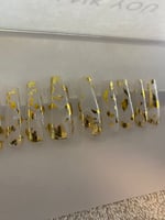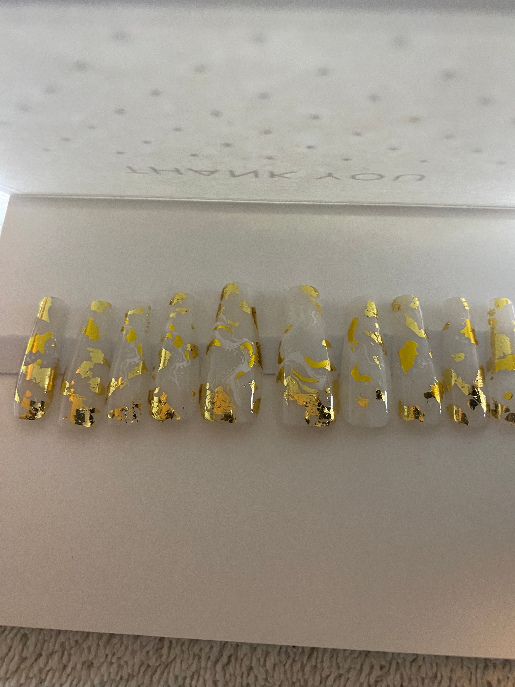 One of a kind, hand made press on nails, made in the USA. Made with cruelty free nail gels. This dazzling nail set made in milky white with high quality gold leaf is an elegant eye catching stunner. With pops of pure white embellished on the stickers top coated on, there is no limit to what you can wear with this nail set! (Long length pictured)