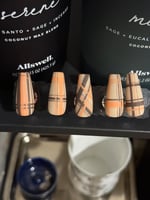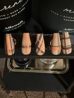 One of a kind, hand made press on nails, made in the USA. Made with cruelty free nail gels. This gorgeous nail set says style and class in timeless plaid. Deep dark chocolate gel over a very light nude plaided with a summery peach. Detailed line work says it all. (Long length pictured)