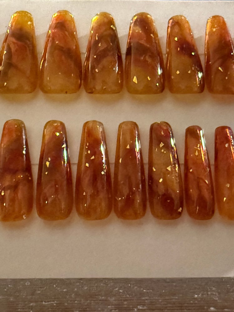 Sheer flame-inspired nails with gold flakes and fiery depth — a bold rebirth of Amber Embers.