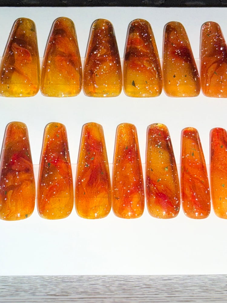Phoenix Flame captures the fierce beauty of fire itself. Featuring sheer layers of jelly red, orange, yellow, and deep brown, accented with flickering gold flakes and glowing cat-eye shimmer, this set feels alive with movement and light. The design mirrors flames rising and dancing, evoking renewal, power, and unapologetic beauty.
