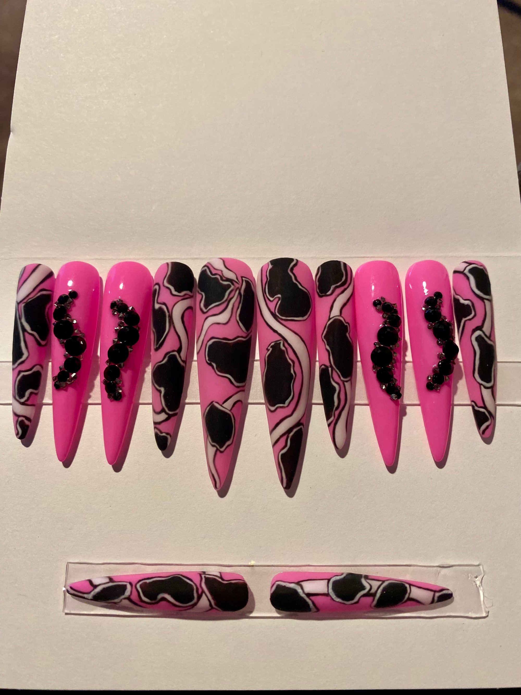 One of a kind, hand made press on nails, made in the USA. Made with cruelty free nail gels. This abstract bubblegum pink selection is sure to be a conversation starter! Matte top coat on a few nails along with shiny top coat gives the best of both words. (XX Long length pictured)