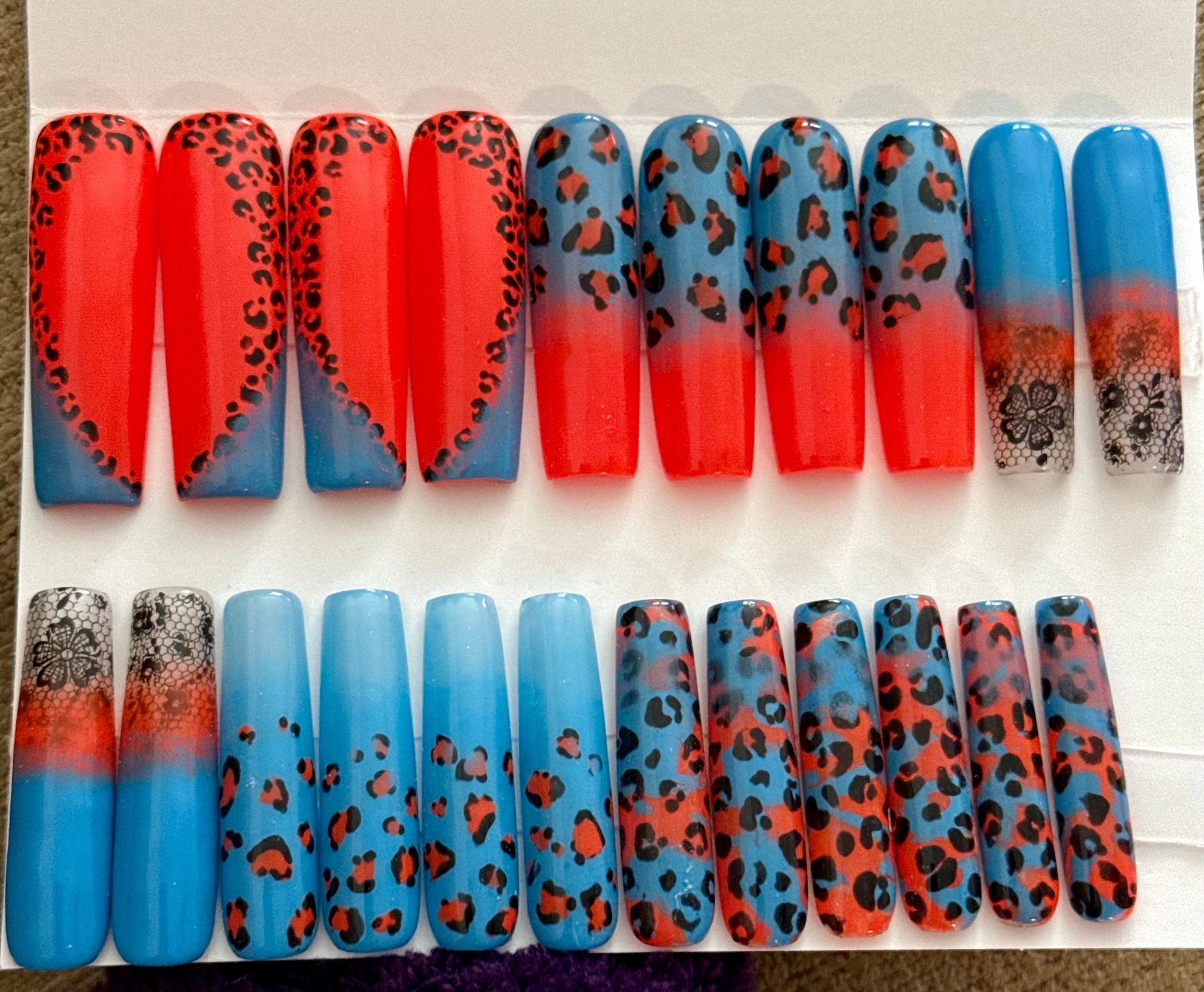 Rare Leopard is not here to whisper—it’s here to ROAR. This unapologetically bold set features a vibrant fusion of electric blue and hot red, accented by leopard print, ombre fades, and black lace-inspired floral tips that add just the right touch of edge and flirtation.