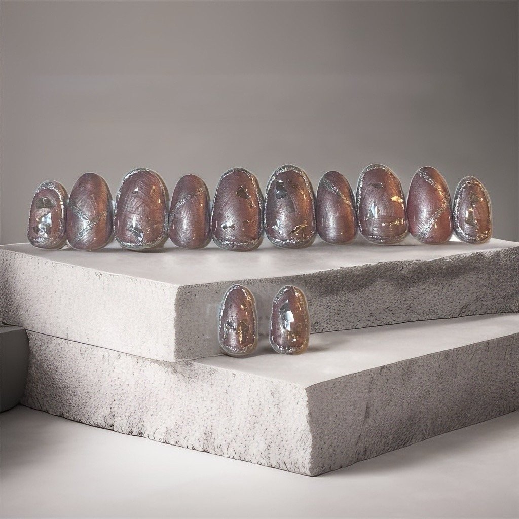 One of a kind, hand made press on nails, made in the USA. Made with cruelty free nail gels. Silver Linings is just that: a set with textured silver lining around some nails and silver line work on others. This set also includes silver flakes encapsulated inside! (Short length pictured)