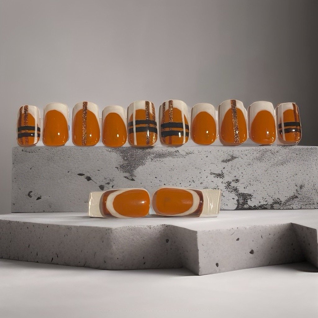 One of a kind, hand made press on nails, made in the USA. Made with cruelty free nail gels. This tri-colored set is stunning all around! It features a beautiful cat eye color over a toasty color and black and white stripes all over a French tip. Sounds quite busy but it's quite beautiful. (Short length pictured)